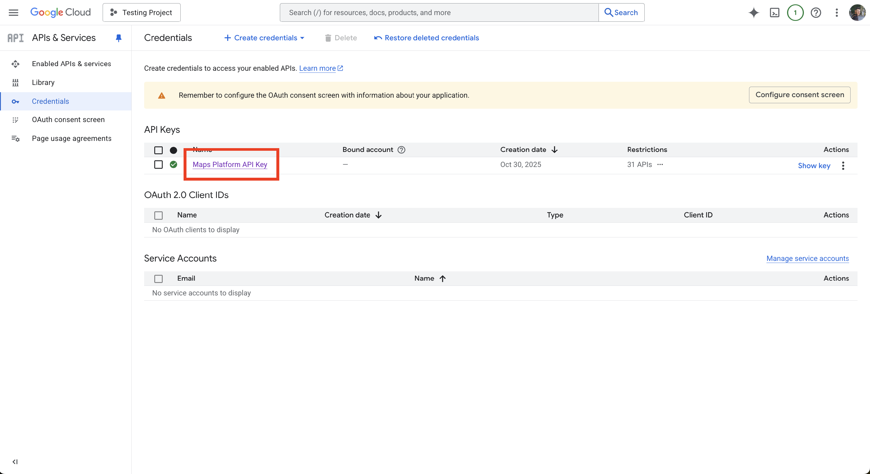 From the Credentials screen, find the “Maps Platform API Key” and click “Show key”.